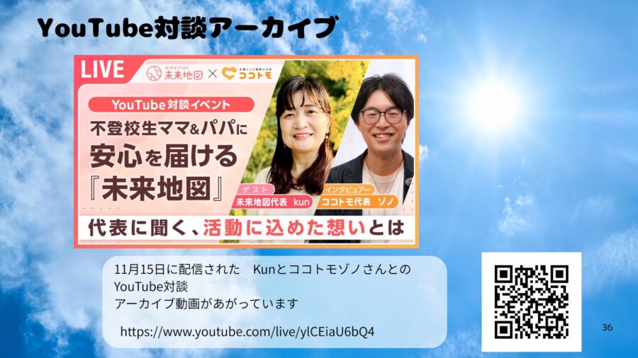 ココトモ代表ゾノさんと未来地図代表KunさんがYouTubeで対談された内容のアーカイブが見られます!会の雰囲気が伝わると思います。良ければご覧くださいね。