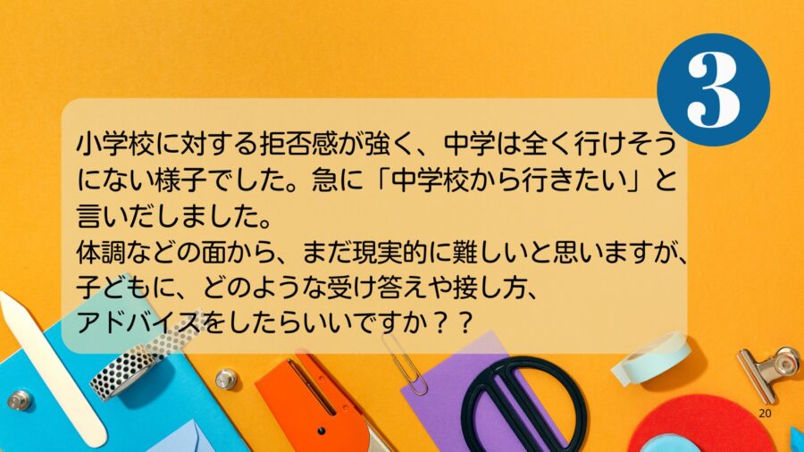 学校関係に相談して安心材料を増やしたり、お子さんが言葉通り行けるのならそれもいいし、行けなかったときは「行けなかったね」と優しく受け入れてあげればいい。いつもお子さんの味方であることを伝え続けることの大切さを話してくれました。