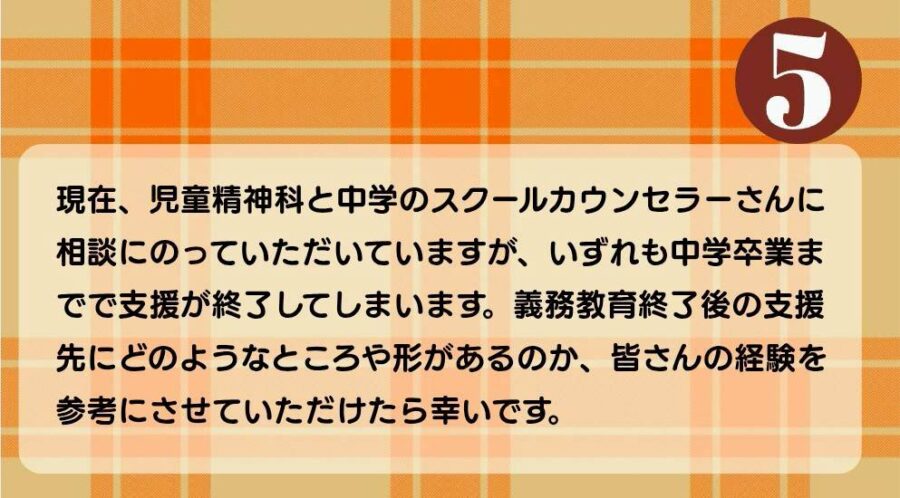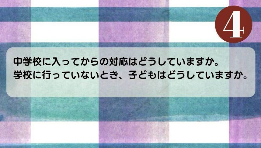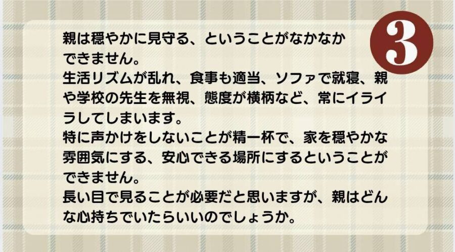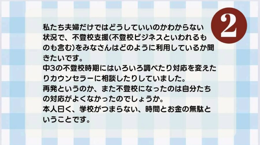 「また不登校になったのは自分たちの対応がよくなかったのでしょうか」の部分を「そんな事はないよ!」とあたたかく伝えていたのが印象的でした。