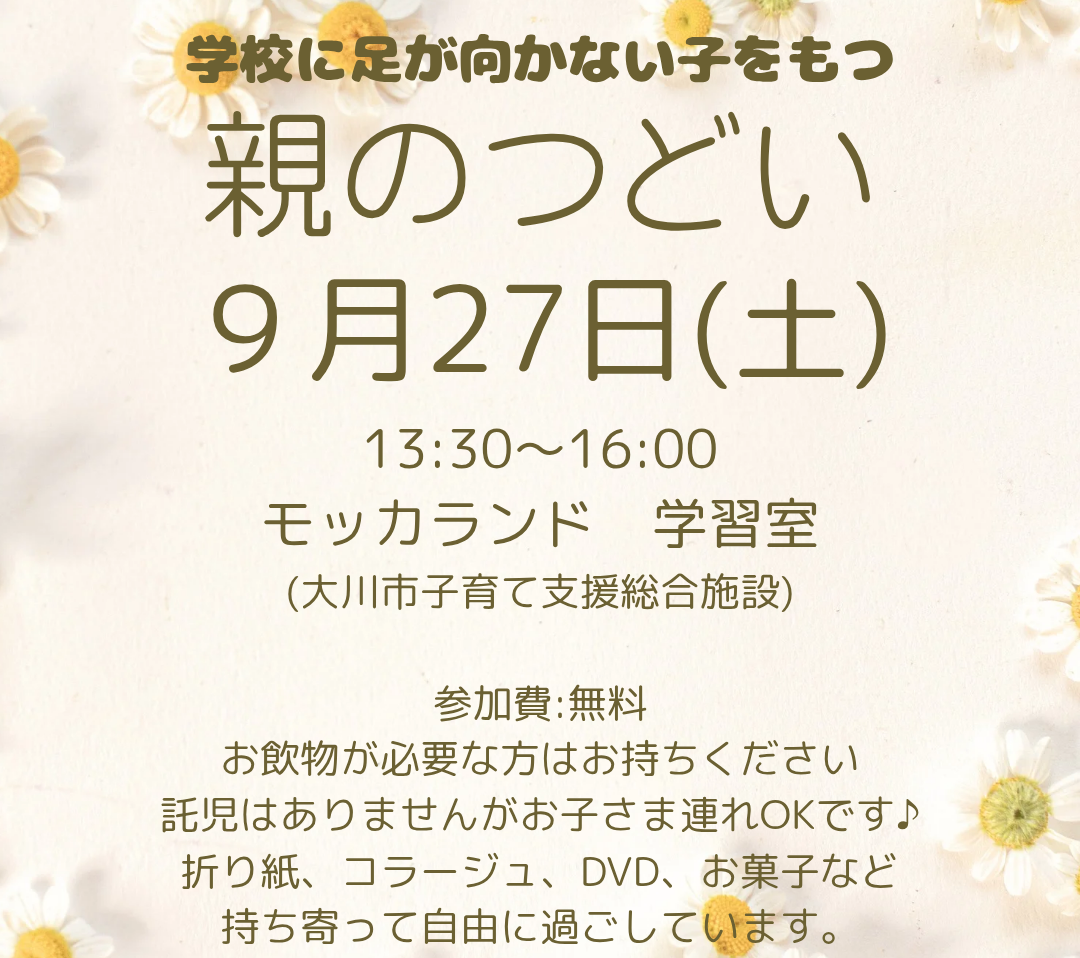 福岡県大川市周辺で、学校が苦手だなというお子さん(不登校・行きしぶり等)をもつ保護者の集まりをしています。