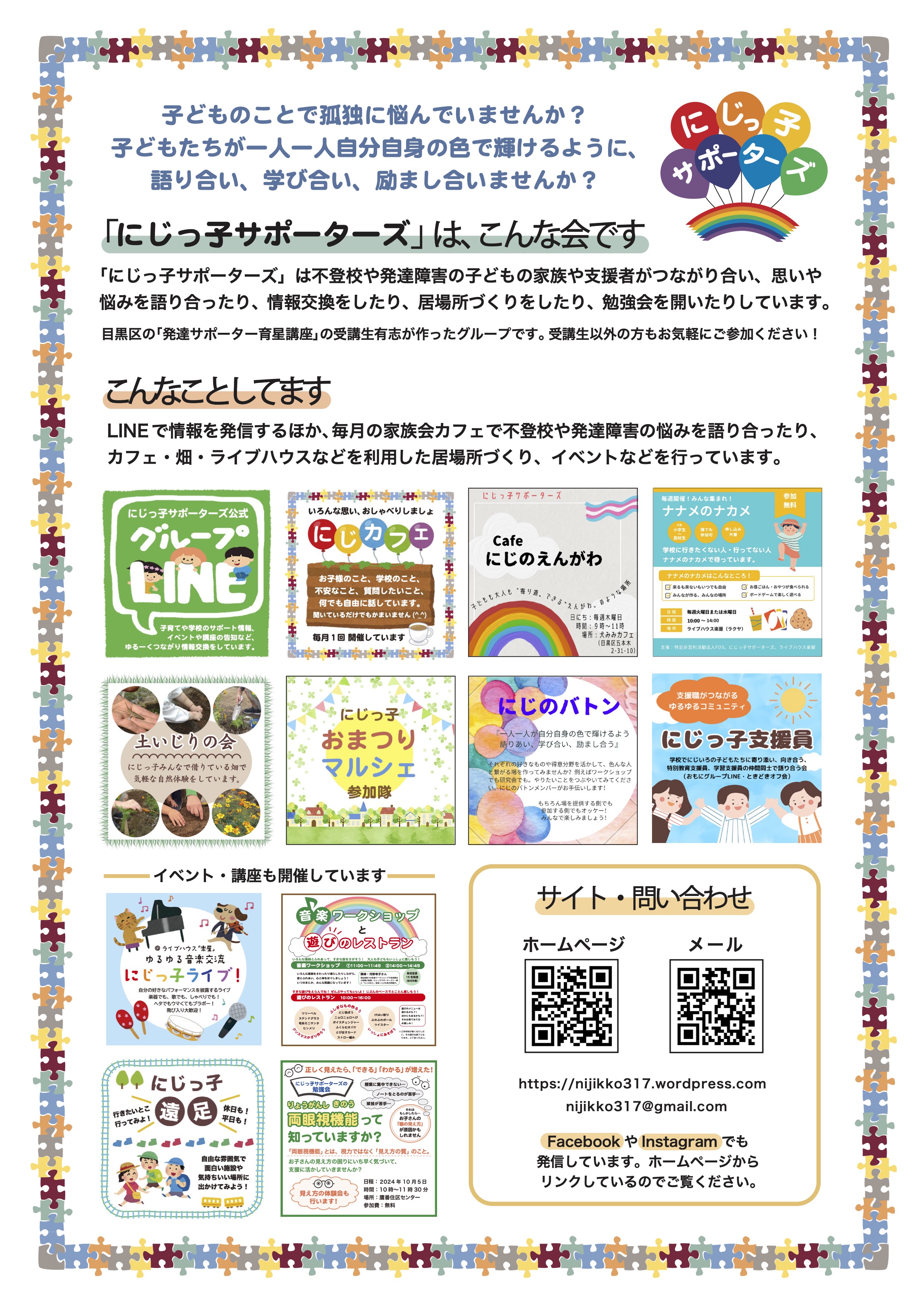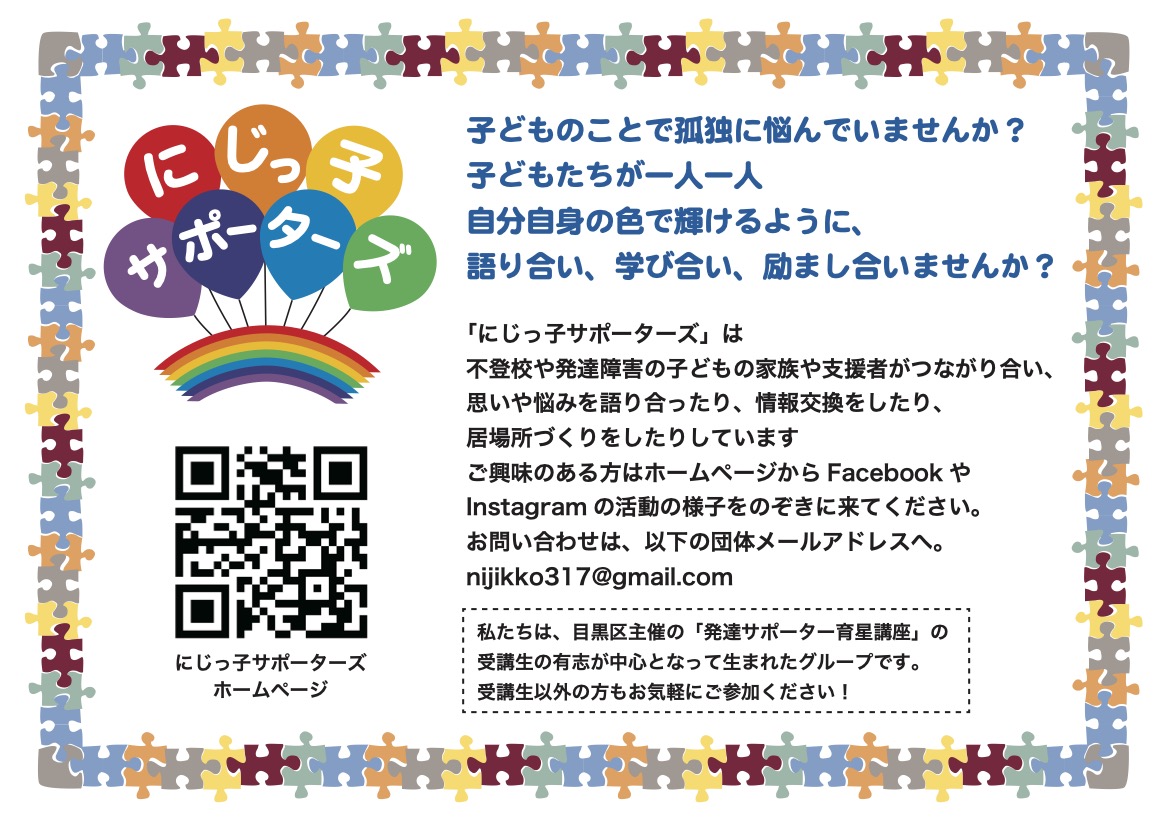 にじっこサポーターズは、不登校や発達障害の子どもの家族や支援者がつながり合って、思いや悩みを語り合ったり、居場所づくりの活動をしたりしています。