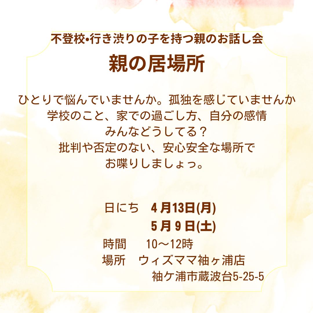 | 名称 | 親の居場所 〜不登校の子をもつ親のお話し会・次回4月13日(月)・5月9日(土)〜 |