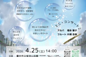 1,500円(焼菓子・お茶・ミニコンサート付き)お子さんが不登校、行き渋り、別室登校、 朝起きられないetc.…お悩みの保護者の方で 集まってお話ししませんか? 子どもの不登校を経験する代表がフルート奏者 のため、リラックス・リフレッシュを目的とした プロの演奏家によるミニ・コンサート付きで開催 しています。 不登校’sファミリー =お母さま、お父さま、おばあさま、おじいさま… また、どの地域の方もご参加いただけます。...