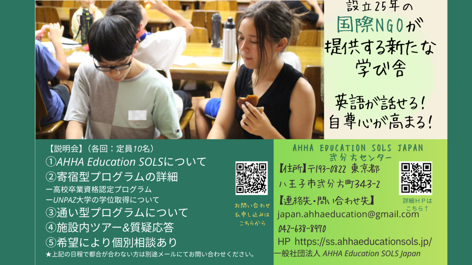 | 場所 | 一般社団法人アハエデュケーションソールスジャパン 弐分方センター 東京都八王子市弐分方町343-2 |